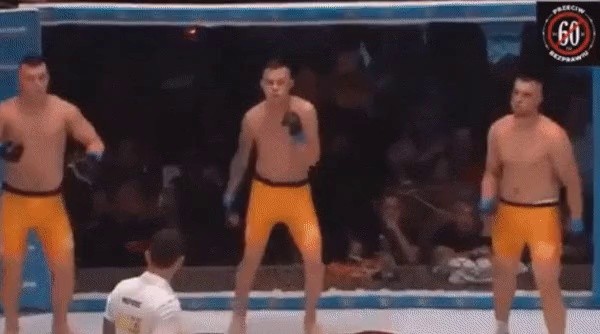 One real fighter vs. three ordinary people.
