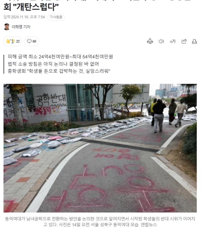 13:54 11/15/2024 [Kookmin Ilbo] Dongduk Women’s University lost 5.4 billion won… The Alumni Association also turned its back on