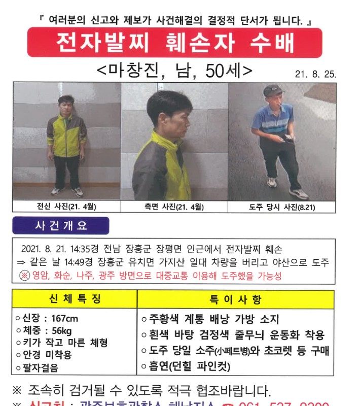 20:55 08/31/2021 Ma Chang-jin, a child sex offender who cut off his electronic anklet in Jangheung-seo, Jeollanam-do, and ran away, has been on the fence for 11 days.