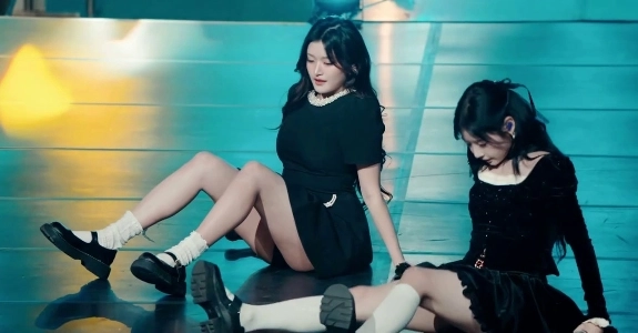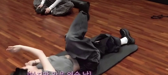 07:28 12/18/2025 (SOUND)Eyelet Minjoo practicing choreography, pelvis in gray sweats pressed against the floor