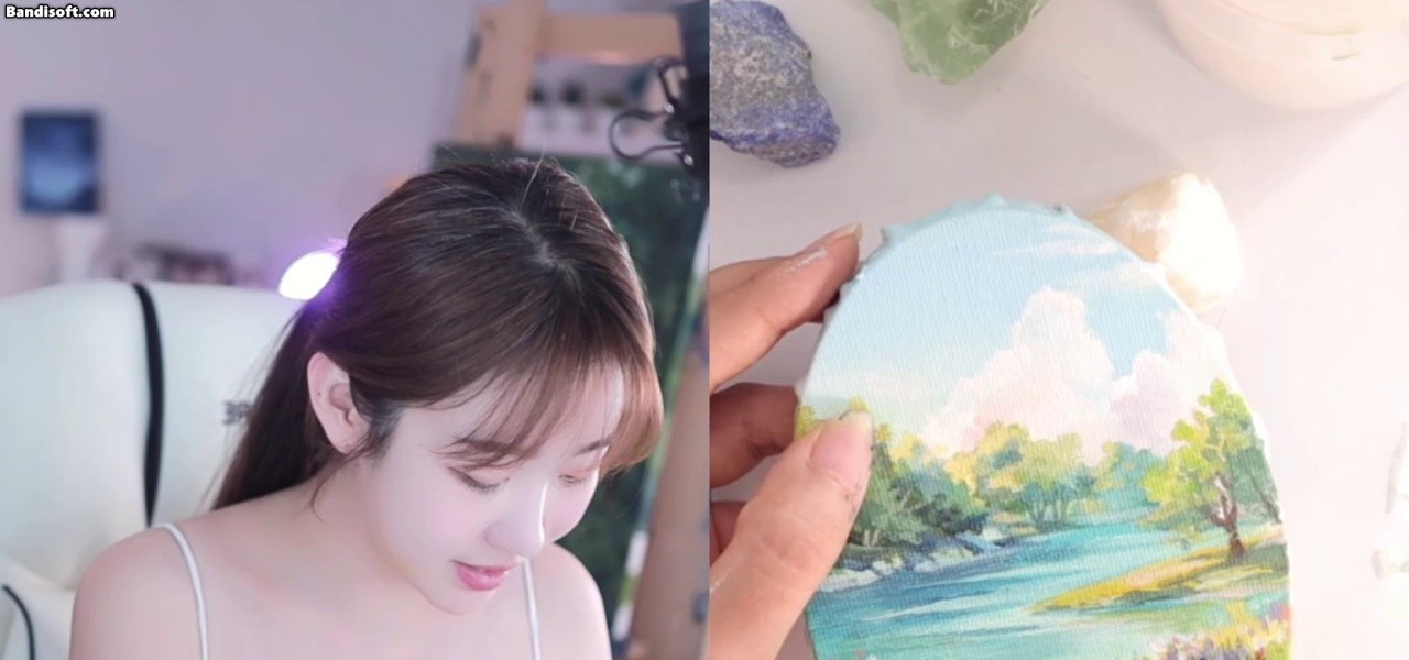 14:44 08/30/2024 Dulgiya draws a picture while wearing a white string tank top. Her cleavage increases concentration.