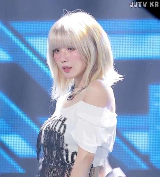 09:57 07/1/2024 Blue crop top + white hot pants, slim waist and belly button, Le Seraphim Hong Eun-chae