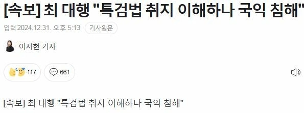 04:35 01/1/2025 [Breaking News] Acting Choi “”””I understand the purpose of the Special Prosecution Act, but it infringes on national interests””””
