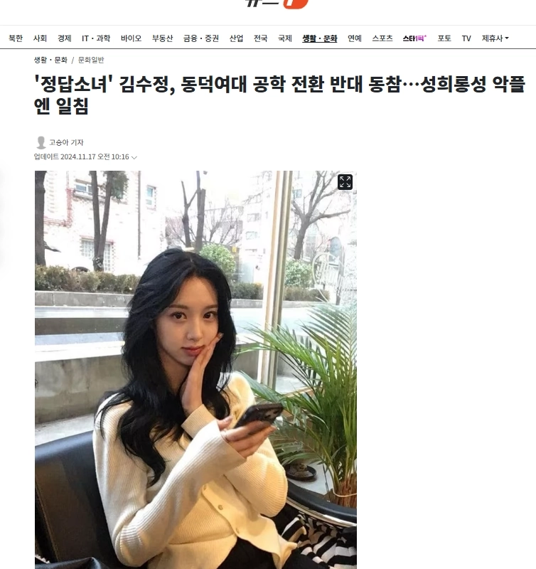 13:23 11/18/2024 ”Correct Answer Girl” Kim Soo-jeong joins opposition to Dongduk Women’s University’s conversion to engineering… A warning against sexually harassing malicious comments