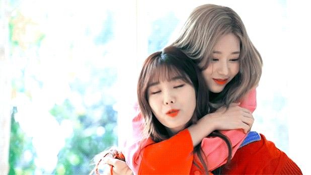 IZ*ONE MIN JU on EUN BI’s back.
