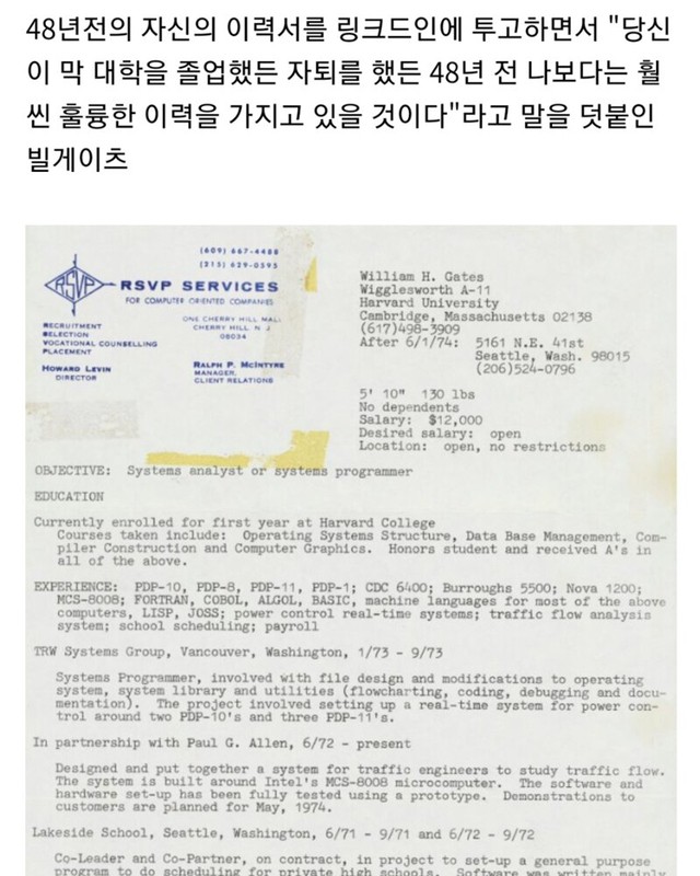 빌 게이츠 “”누구든 48년전 내 이력서보다는 훌륭할 것””