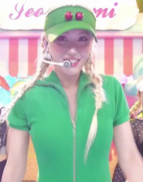 03:09 07/10/2024 Minji from New Jeans with braided hair…a short-sleeved T-shirt with a green apple design, a subtle bounce