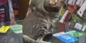 Gif is a cat that was surprised while grooming.