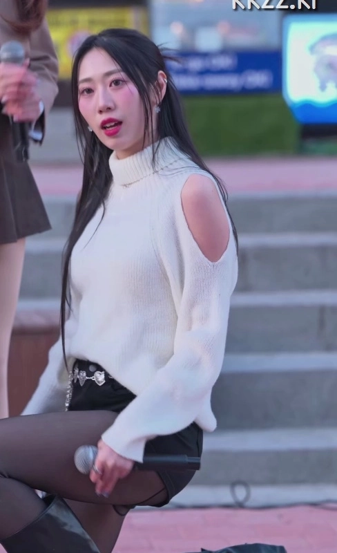 Red Velvet Irene with patterned gums + long boots and flowing thighs