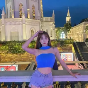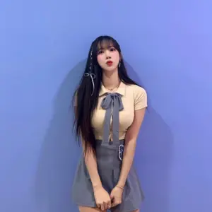 Hanna Kim’s bottoms are missing, sleeveless