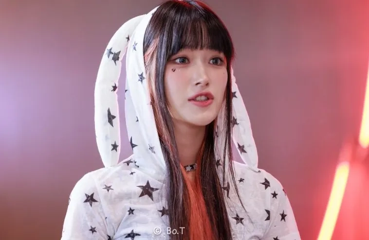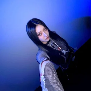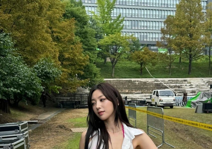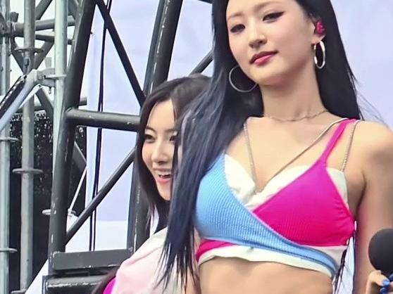 02:23 09/9/2024 Haiki Riina exposing her cleavage while leaning deeply in a red striped corset tank top