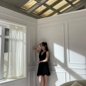IU in the waiting room with a sexy face in a black dress
