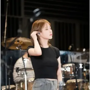 Thin black short-sleeved T-shirt, subtly bulging chest line IU