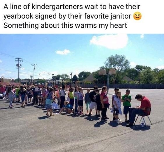Kindergarten students lined up to get graduation album autographs