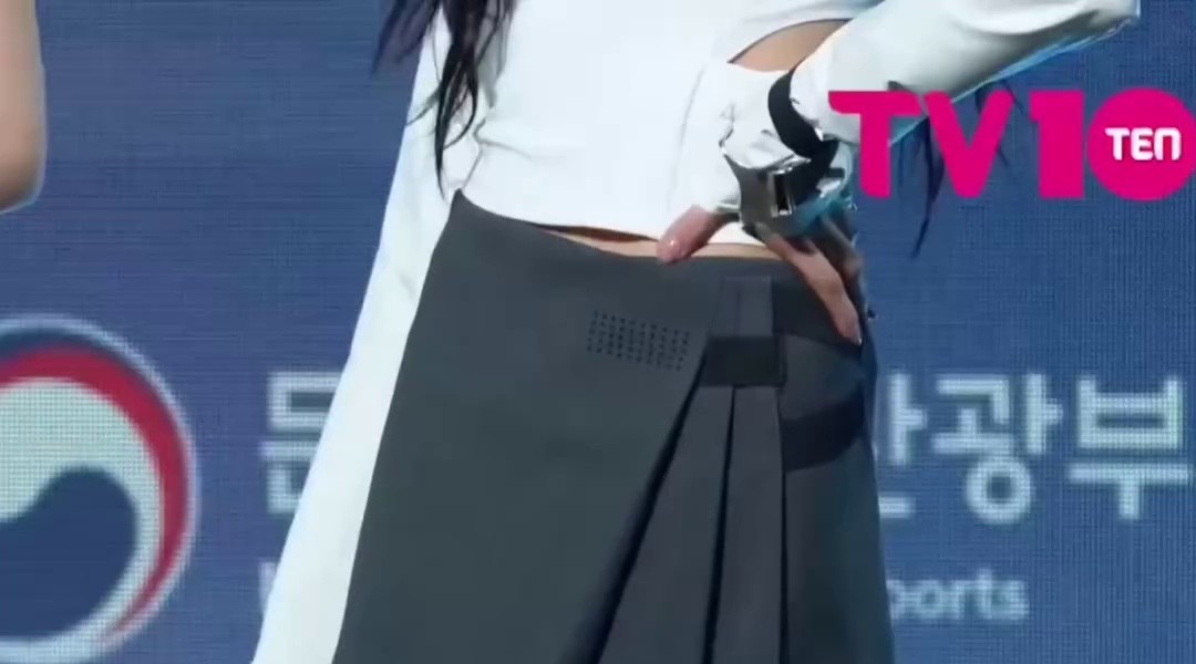 03:09 07/10/2024 Minji from New Jeans with braided hair…a short-sleeved T-shirt with a green apple design, a subtle bounce