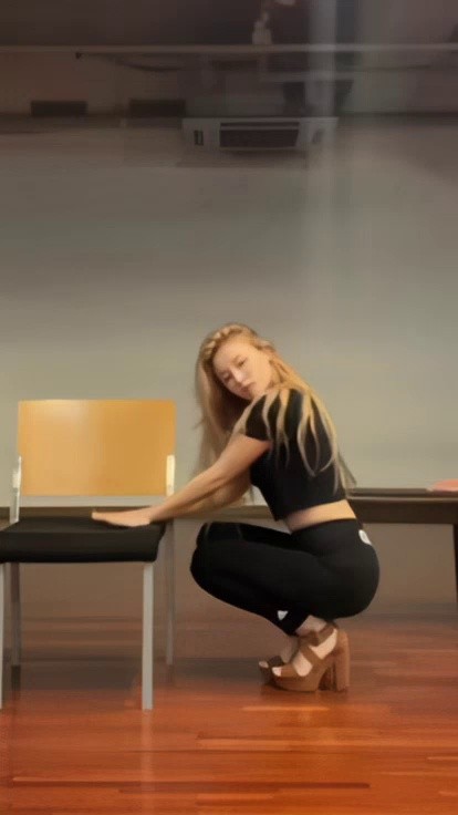 Nancy and MOMOLAND in a short and tight nude dress
