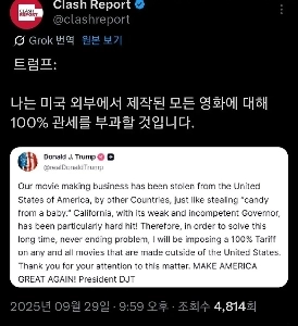 23:09 09/29/2025 [Breaking News] Trump: 100% of the tariffs will be imposed on all movies produced outside the United States.