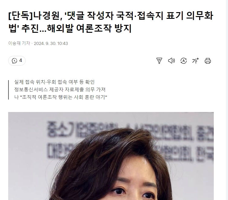 05:16 09/30/2024 [Exclusive] Na Kyung-won, ”Law to make it mandatory to indicate the nationality and address of the commenter”