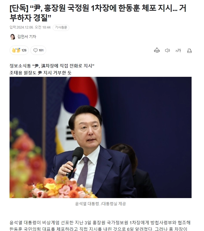 23:56 12/5/2024 [Exclusive] “尹, orders Hong Jang-won, First Deputy Director of the National Intelligence Service, to arrest Han Dong-hoon