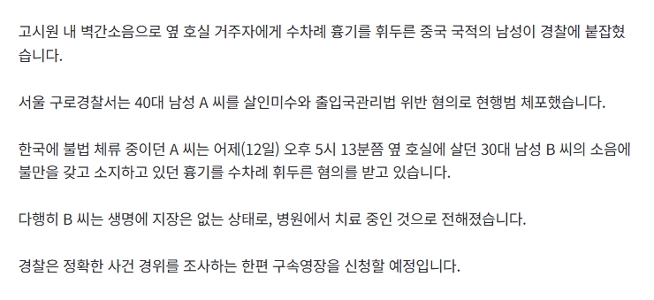 19:39 11/12/2025 [Exclusive] “”””I can’t stand the noise between the walls of the gosiwon””””. Chinese man arrested for attempting to kill his neighbor with a weapon