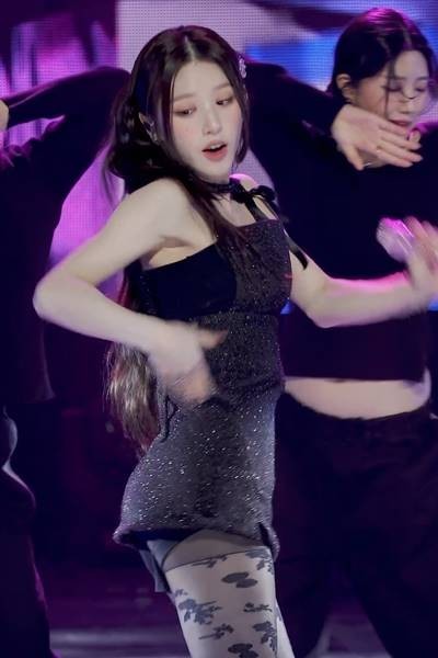 A tight black dress with a red heart on her chest. ITZY YUNA’s hip