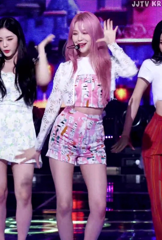Flamboyant pattern, sleeveless shorts. fromis_9 Baek Jiheon.