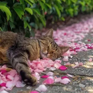 cat sleeping covered in flower petals