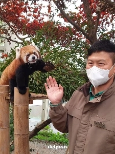 Red panda hides behind its zookeeper out of shame
