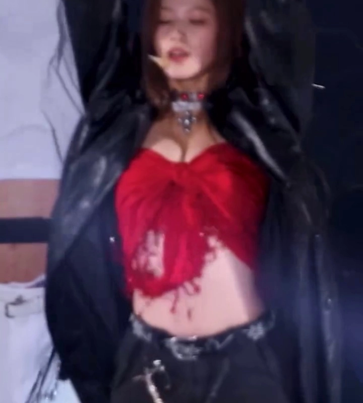 Sana’s cleavage in a red ribbon bra top on stage + her waist in the practice room