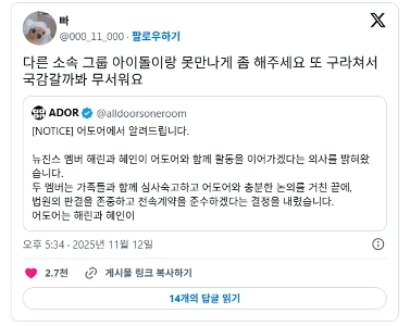 03:52 11/13/2025 ‘Unilateral notice’ for Minji, Daniel, and Hani to return. Adore: “Please show your sincerity of intention to return.”