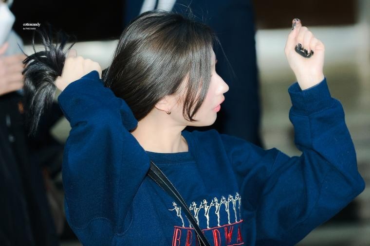 TWICE NAYEON. SANA with her face under her armpit