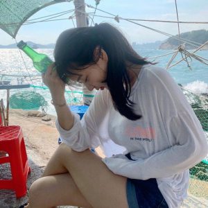 Shin Jaeeun, who swelled up because she ate ramen. A mint colored singlet.