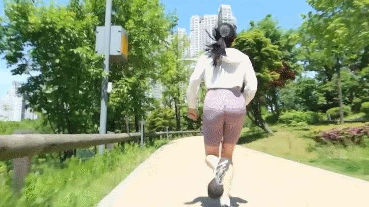 A wife running in tight leggings, showing off her butt