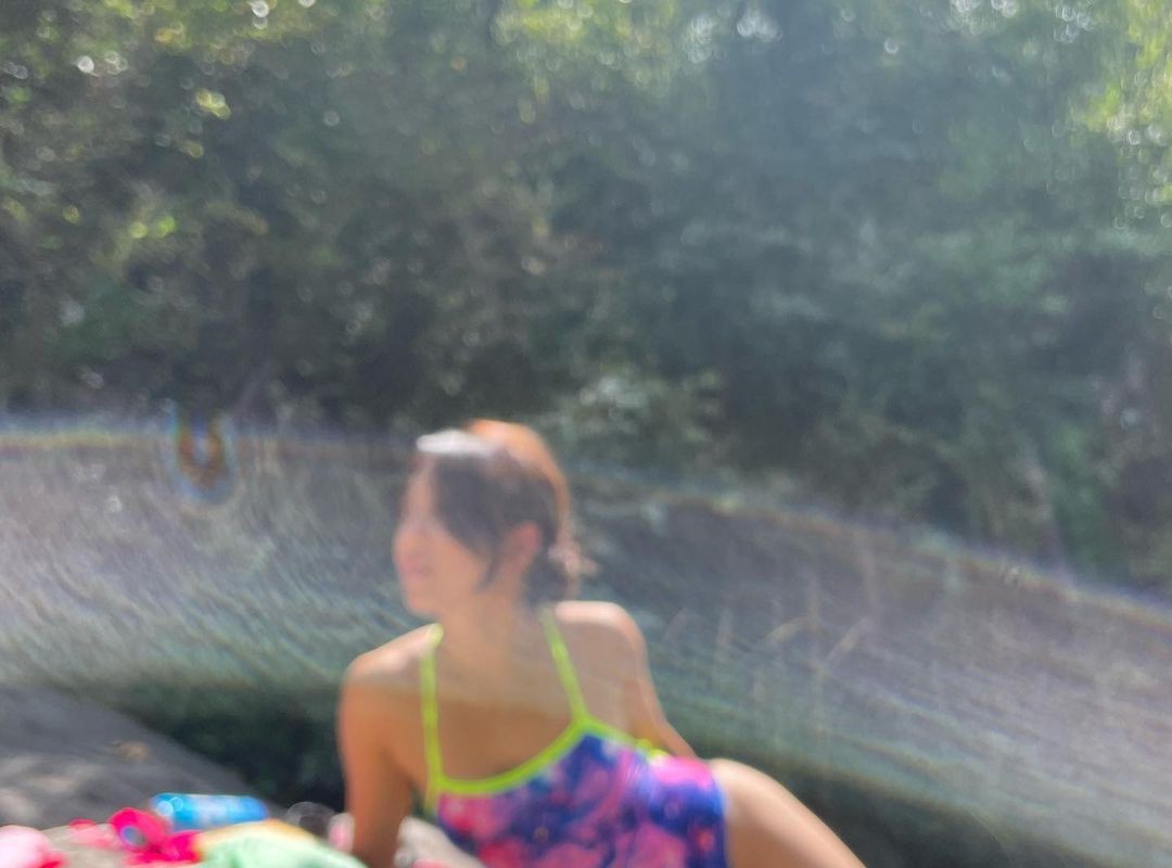 MOMO’s black swimsuit.