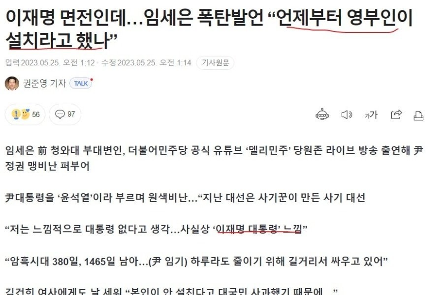 04:43 05/25/2023 Lim Se-eun calls President Yoon Suk Yeol and criticizes primary colors…”The last presidential election was a fraud made by a con artist