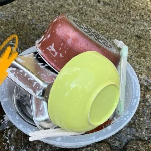 06:50 08/14/2024 A middle-aged couple washing dishes in a valley, let’s point out, “”””Do you take home the food with the stains on it?”””” loudly