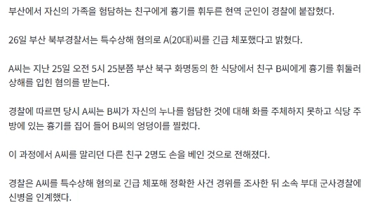 04:36 11/26/2025 [Breaking News] ‘Enraged’ by a friend who cursed his older sister… An active-duty soldier in his 20s who brandished a weapon was arrested in Busan.
